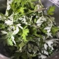 畑のヨモギを収穫し、ペーストにして冷凍保存する